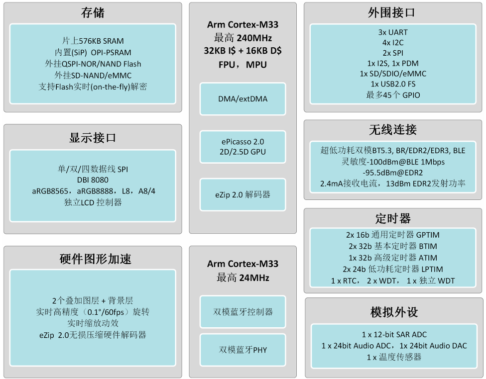 SF32LB52系列芯片采用大小核架构设计,大核240MHz,小核24MHz,大核跑应用小核跑协议栈功耗极低,,开发简单上手速度快。全系标配576KB SRAM和自研2D/2.5D GPU,在480*480分辨率以内可做到60Hz流畅驱屏,深入适配LVGL7、8、9多个版本,无需特别修改,直接就能用GPU加速。非常适合手环手表、码表、AI玩具等各种带屏物联网设备。