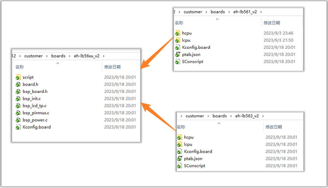 有时同一个型号的HDK会贴不同的芯片,为了避免在不同的板子目录下放置相同的IO设置代码,可以将公共代码放到一个目录, 再由不同板子来引用,如下图所示,公共代码放在了eh-lb56xu_v2,开发板HDK561对应文件夹eh-lb561_v2,开发板HDK563对应文件夹eh-lb563_v2, 他们的一级目录可以简化,引用eh-lb56xu_v2下的文件,HCPU和LCPU的仍旧放在这两个开发板目录下。