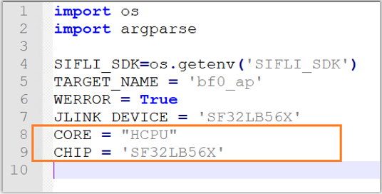 rtconfig.py增加CORE和CHIP两个变量,CORE用于指示对应的核,可以是”HCPU”或者”LCPU”,CHIP为芯片系列名,如”SF32LB56X”、”SF32LB52X”