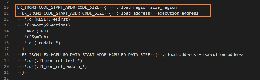 多工程编译时,同样运行于HCPU的主工程和子工程可能都会使用同一个板子目录下的链接脚本,但他们的代码编译地址又不一样, 比如下图是link.sct的代码段部分,起始地址都是CODE_START_ADDR,大小为CODE_SIZE,但在编译主程序和二级bootloader时, 这两个宏的取值是不同的。