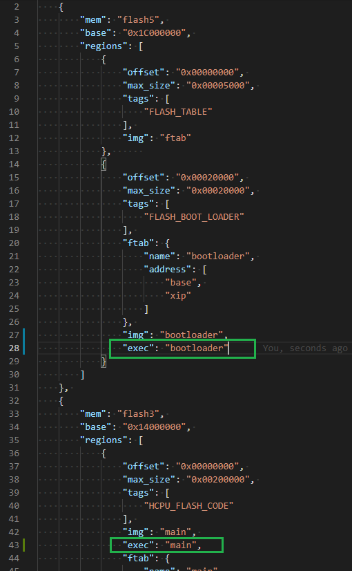 为此,ptab.h的生成脚本增加了一个功能,在ptab.json中使用属性”exec”定义该region是哪个工程的代码执行段, 属性值为工程名,主工程是“main”,子工程与AddChildProj时指定的名称一致。例如下面的ptab.json中, 二级bootloader的代码段以FLASH_BOOT_LOADER命名,主工程的以HCPU_FLASH_CODE命名。