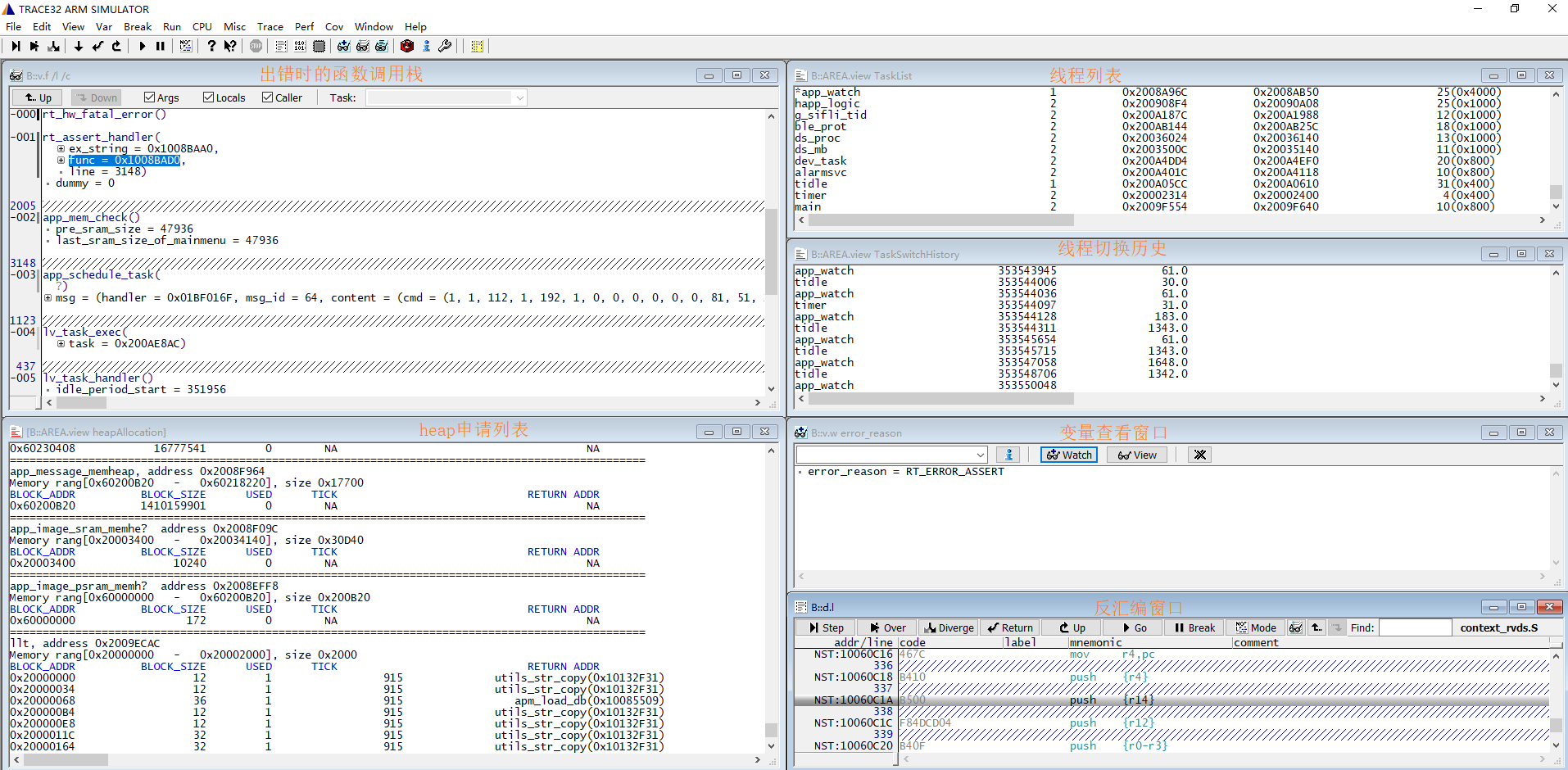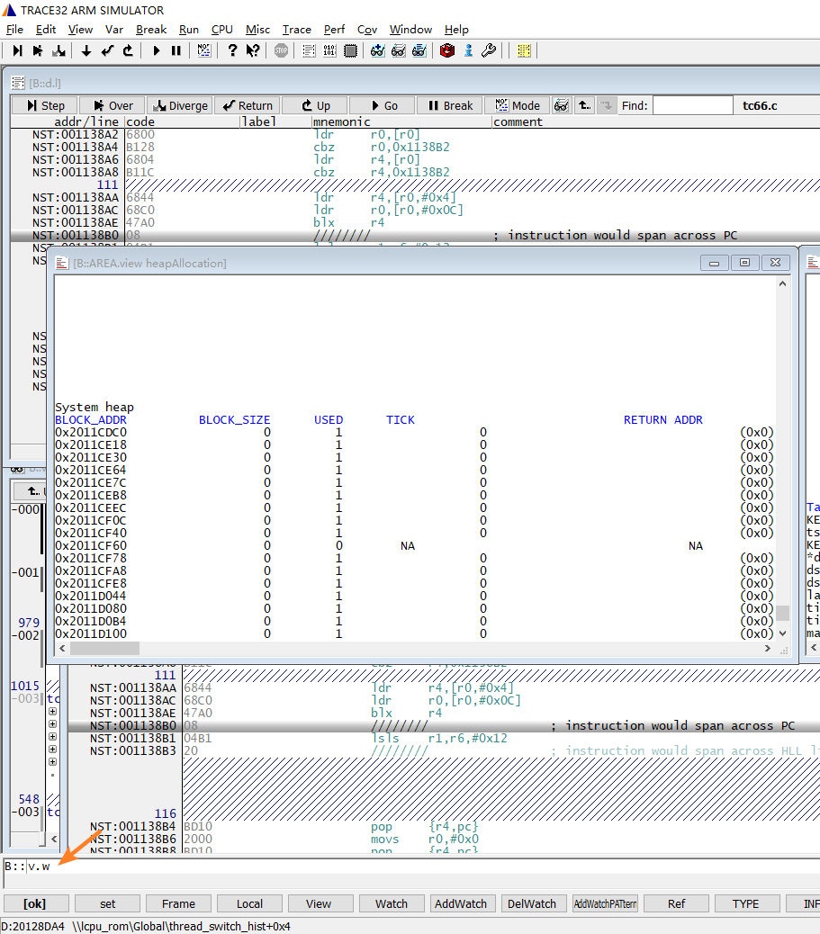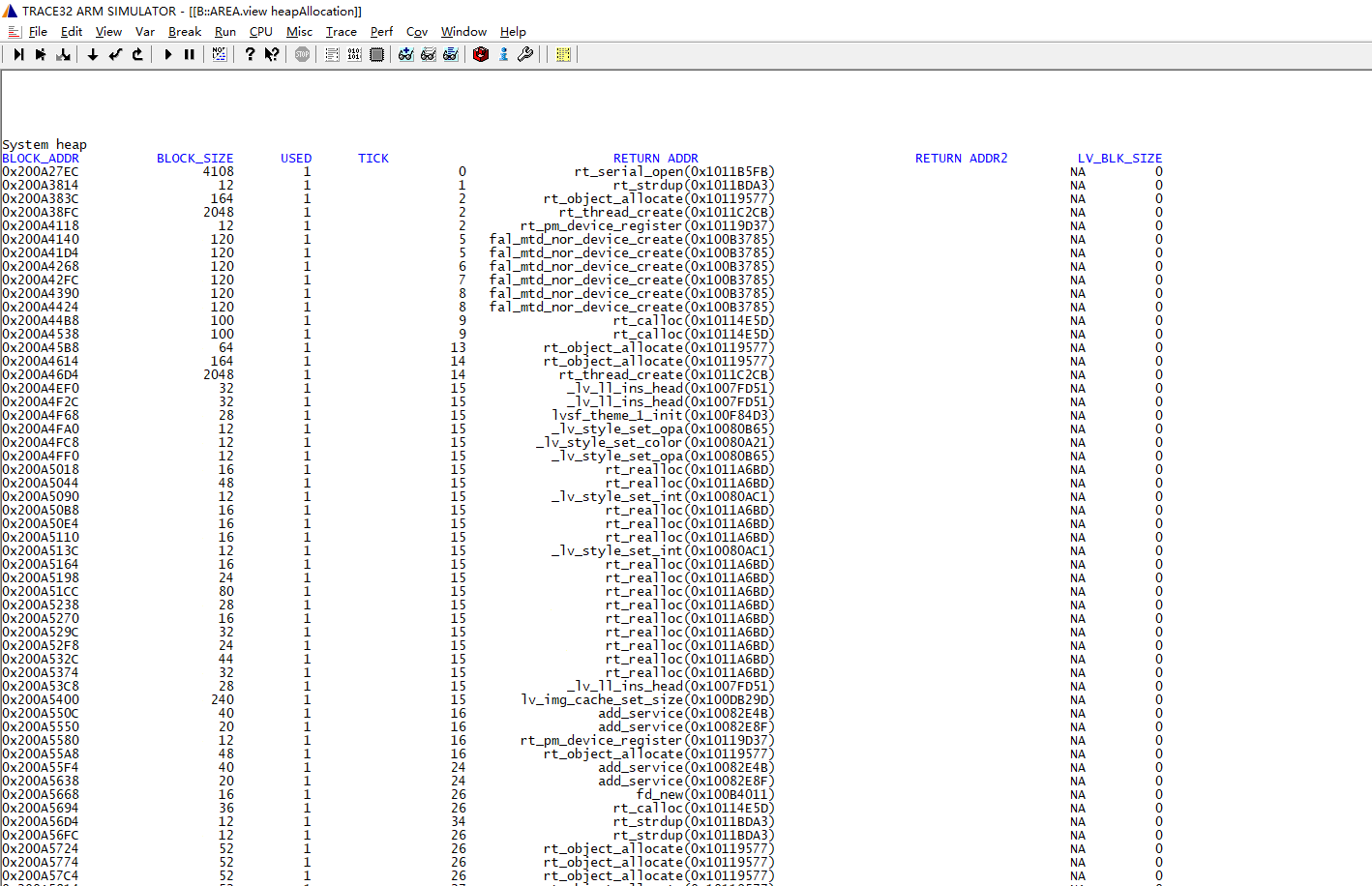 下图为一个检测到heap有泄漏的现场,callstack窗口显示了assert的函数调用栈,heapAllocation窗口的system heap列表显示由rt_malloc申请的内存块的列表, RETURN ADDR显示调用rt_malloc的函数名,TICK为申请时的rt_tick_get时间,