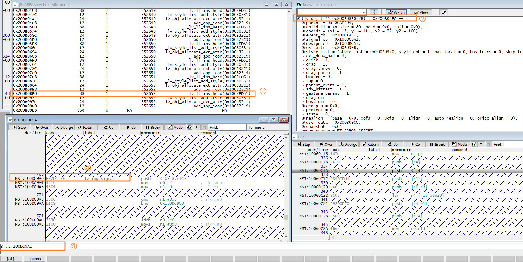 例如HEAP窗口中第一行地址为0x200A27EC的内存块,是由函数rt_serial_open中的指令地址0x1011B5FB前的指令申请,申请的内存大小为4108字节。 由strutc heap_mem结构可知,System heap管理项长度为28字节,所以由内存块起始地址偏28字节就是申请者使用的内存地址, 例如下图中_lv_ll_ins_head函数申请了88字节的内存,内存块起始地址为0x200B08E0,在变量查看窗口中可以用(lv_obj_t*)(0x200B08E0+28)查看这个变量的值, 分析LVGL代码可知只有lv_obj_t的大小是88字节(还需要加上8字节的LVGL链表的关联项,跟在了lv_obj_t之后)。 signal_cb是函数地址,在窗口最下方的命令行中输入L 100DC9A1命令, 打开反汇编窗口显示该地址对应的汇编代码,可知这个函数是lv_img_signal,所以是lv_img控件申请的内存。当出现内存泄漏时,可以结合申请者地址和申请时间分析哪个地方申请了内存但没有释放。
