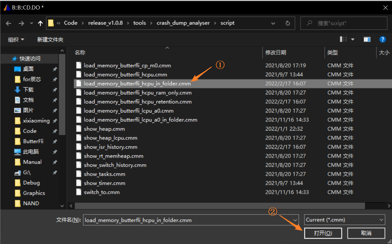 2) 选择脚本load_memory_butterfli_hcpu_in_folder.cmm,点击打开,运行脚本