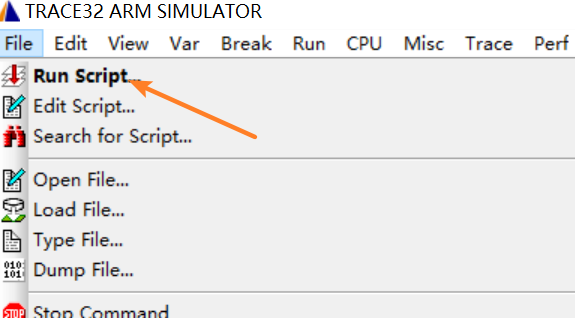 1) 双击运行t32marm.exe,点击File->Run Script打开脚本选择对话框