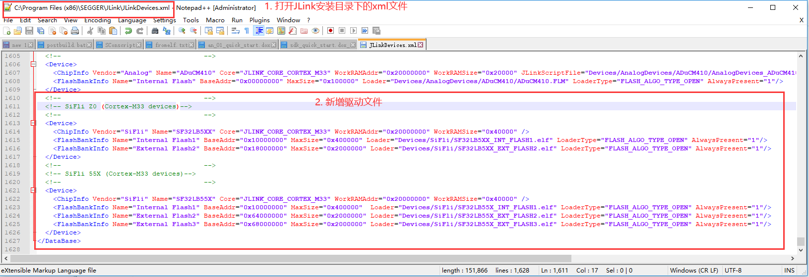 - 修改Jlink注册的Device列表,增加前面添加的文件路径,运行参数等,如下图: