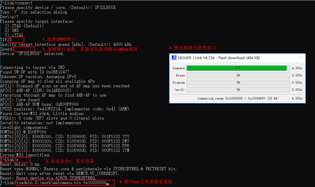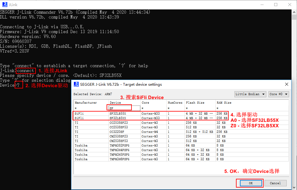 - 打开Jlink,连接,并选择SiFli的device(注意SF32LB55X代表EVB的flash驱动)