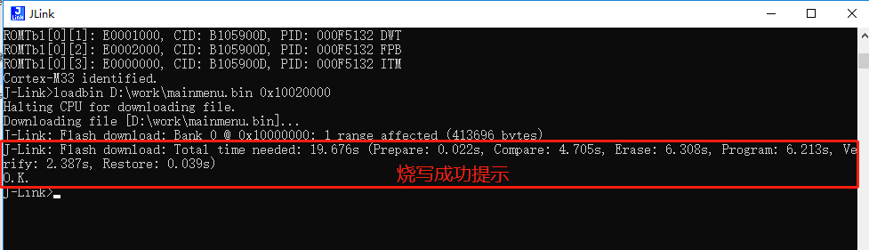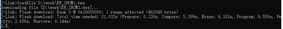 - Hex文件的烧写,只需将loadbin 改成loadfile即可,且不需要带地址