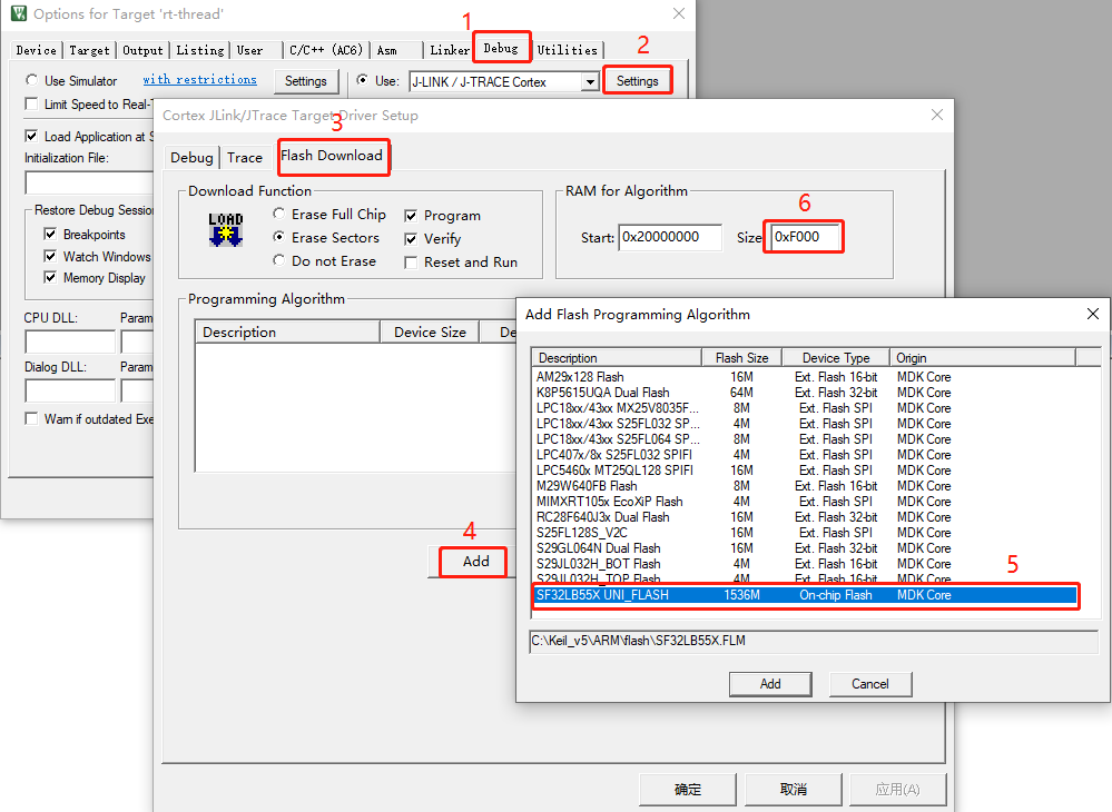 将SifliSDK\tools\flash\keil_drv\sf32lb55x目录下sf32lb55x.FLM,复制到C:\Keil_v5\ARM\Flash下 (此处为默认的Keil安装目录,如果安装到其它目录则放到相应的文件夹下)