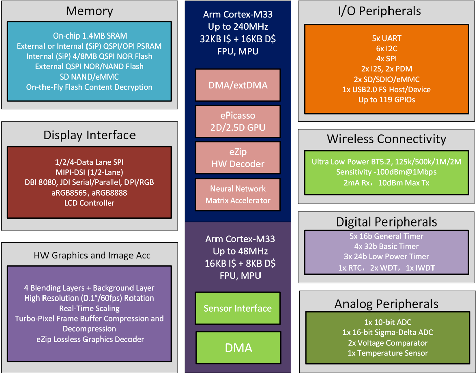 The SF32LB55x is a series of highly integrated, high-performance system-on-chip (SoC) microcontroller units (MCUs) designed for ultra-low-power artificial intelligence of things (AIoT) applications. The chip innovatively employs a big.LITTLE processor architecture based on the ARM Cortex-M33 STAR core, and integrates the industry’s highest-performance 2D graphics engine, an AI neural network accelerator, and Bluetooth Low Energy 5.2. It is widely suitable for various application scenarios such as wearable devices like wristbands, smart mobile terminals, and home automation systems.