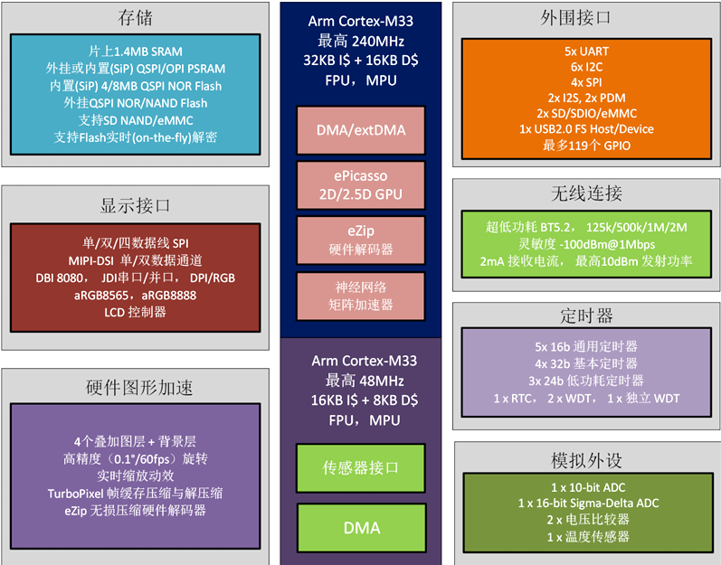 - 主系统搭载CortexM33 CPU@240MHz,1.4MB SRAM内存空间满足大部分通用场景,低功耗系统搭载Cortex-M33@48MHz覆盖高能效比场景